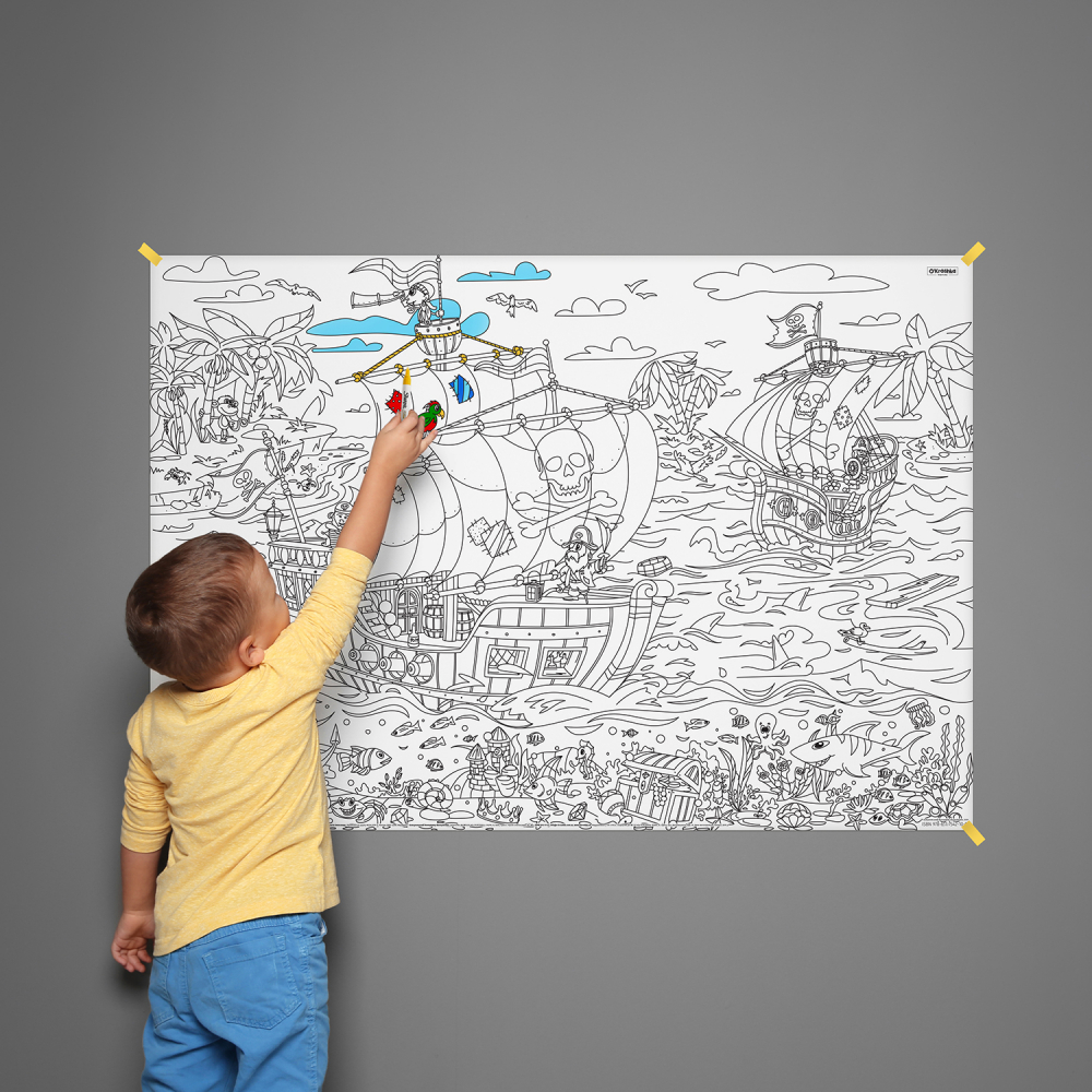 Ви шукаєте спосіб "відірвати" сина-дошкільника від телепрограм або онлайн-битв? Ви хочете з мінімальними втратами для нервових клітин потренувати його навички володіння письмовим приладдям? Ви бажаєте підштовхнути малюка до корисних ігор, в яких буде працювати його уява? Ви просто шукаєте гідний подарунок дитині за розумні гроші? Тоді Вам не обійтися без гігантської розмальовки від О'Kroshka - "Пірати: на краю світу". Подаруйте йому це величезне поле для розвитку творчих здібностей (840 х 590 мм) і вручіть шибенику коробку олівців або фломастерів. Вже через хвилину він зануриться в захоплюючий світ вітрил, які розвиваються на вітрі і солоних крапель, які летять в обличчя, світ таємничих островів і незліченних багатств, що зберігаються на дні безкрайнього океану.